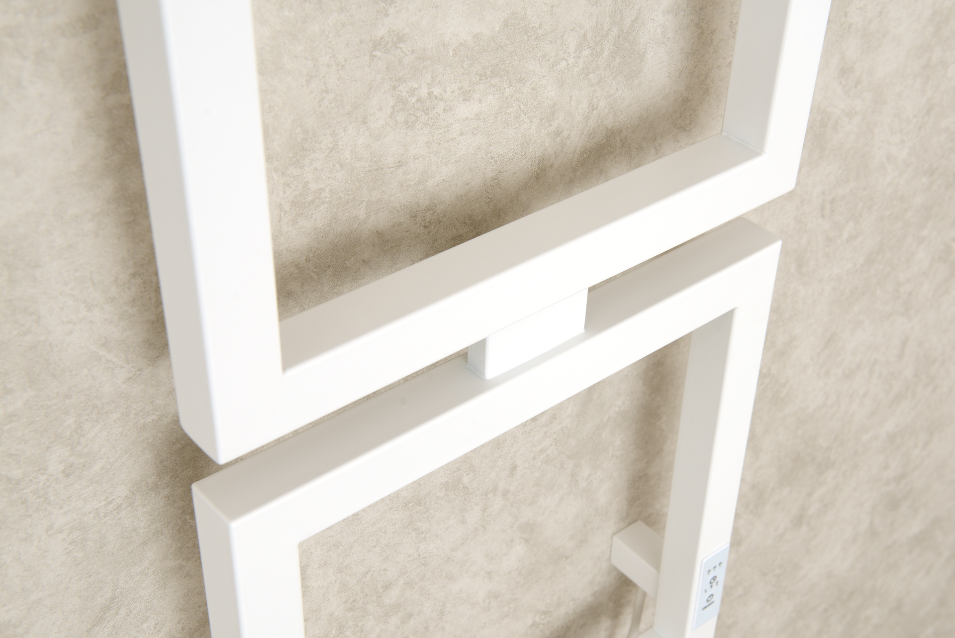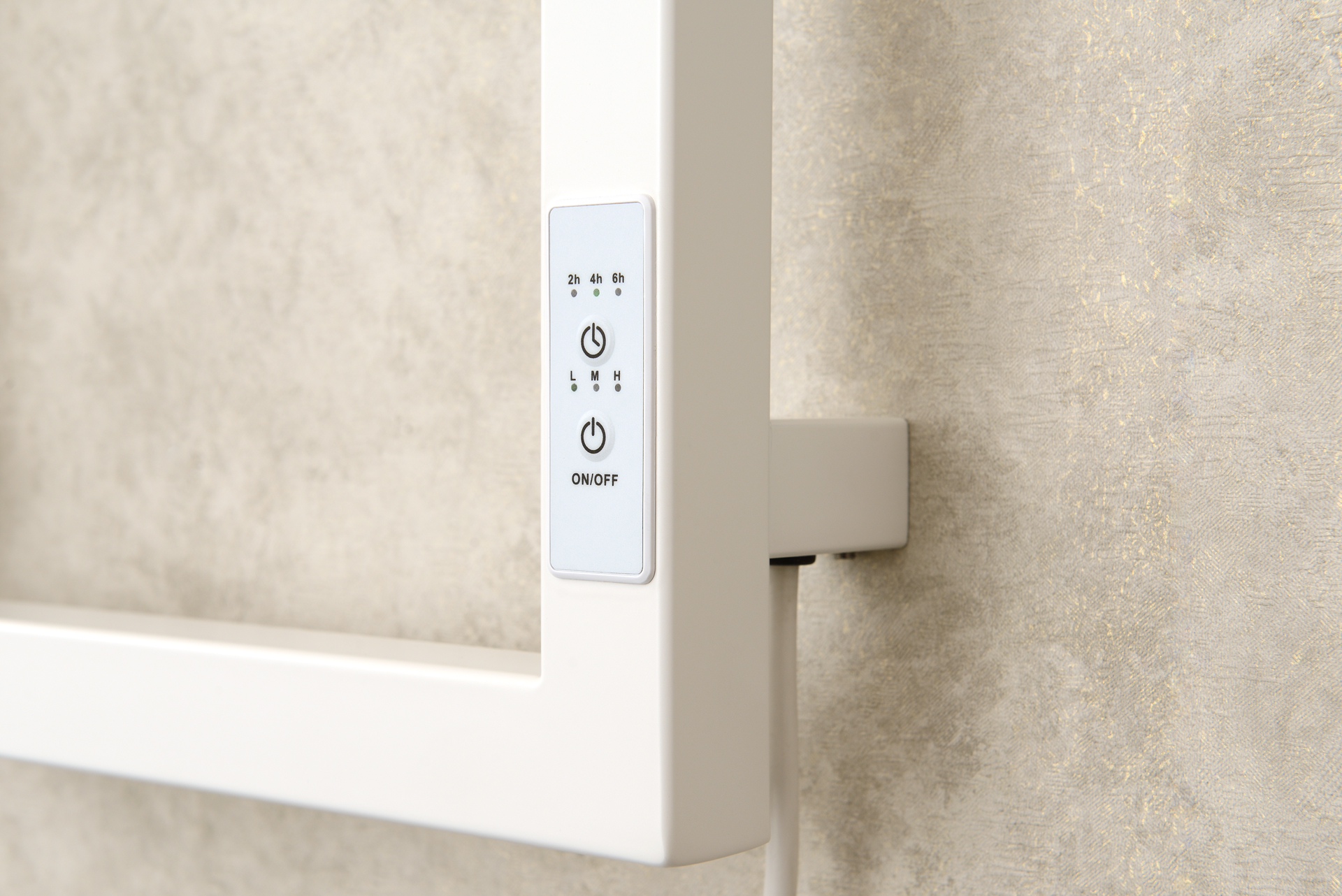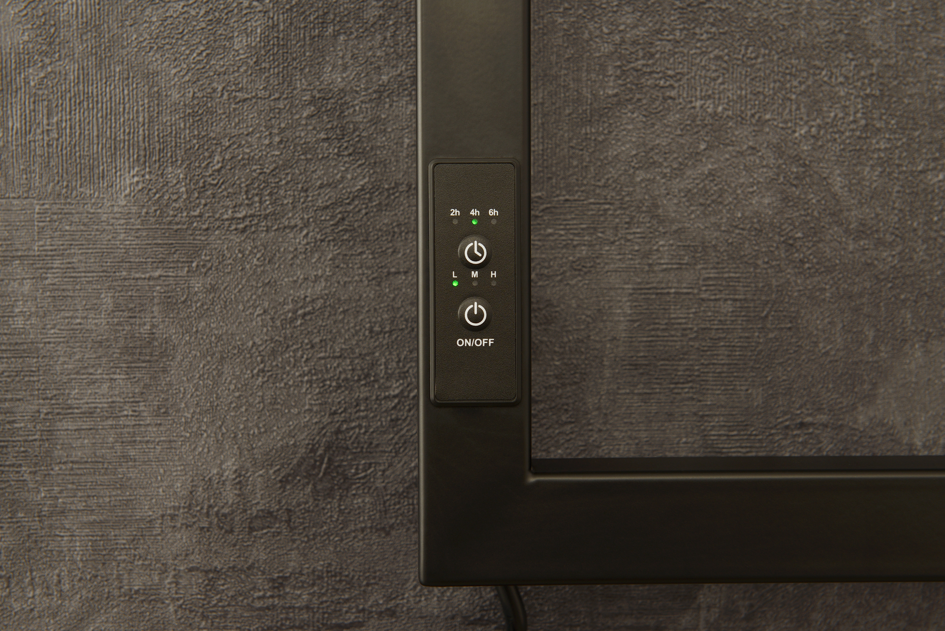 Невероятно простой, интуитивный интерфейс позволяет быстро выбрать подходящий режим работы. Управление осуществляется с помощью всего двух кнопок. Нижняя — служит для включения и выключения устройства, а также для настройки температуры. Верхняя кнопка предназначена для установки таймера отключения — на два, четыре или шесть часов. Светодиодная индикация выбранного режима работы позволяет быстро понять, активен ли полотенцесушитель, и какой режим работы установлен.